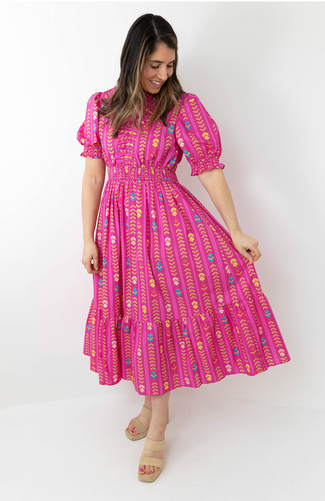 Effortlessly feminine with just the right pop of color, the Vibrant Ruffle Smocked Midi Dress is made for sunny days and statement moments. Featuring a flattering smocked waist and soft puff sleeves, this midi dress hugs comfortably while flowing beautifully with every step. The tiered skirt and delicate ruffle trim add movement and charm, making it perfect for brunch, vacations, or casual events.