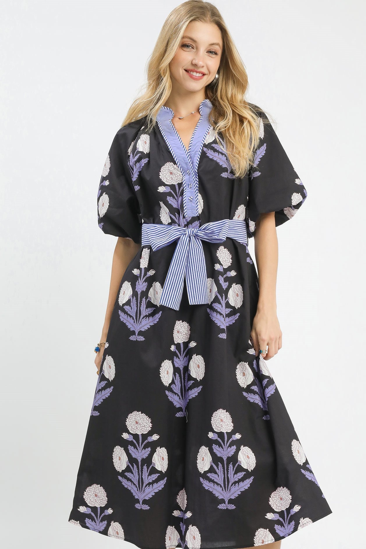 Effortlessly feminine, this floral print V-neck maxi dress features short puff sleeves, contrast striped trim, and an adjustable self-tie waist for a flattering fit. Made from breathable 100% cotton and fully lined for comfort, it’s perfect for everything from brunch dates to special occasions.