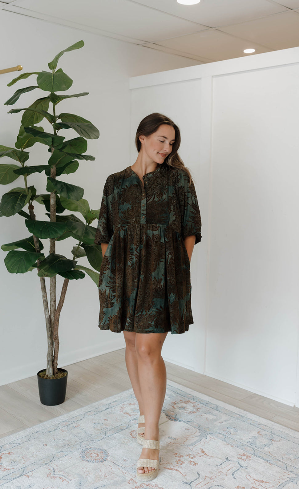 3/4 sleeves velvety floral jacquard dress with side pockets.